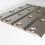 The blades shown below are used on a waste plastic chopper to reduce plastic offcuts from moulding machines into reusable pellets. They are made from D2 Tool steel plate, machined, ground, hardened and then finish ground all over after hardening on the four long faces to give a precision blade that can be adjusted very tight on the anvil and provide long service life. They can also be reground as needed but must be done as a set. These blades also have a secondary back grind on the cutting edge.